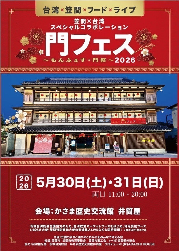 門フェス(もんふぇす・門祭)」は、かさま歴史交流館井筒屋を会場に、台湾の文化と笠間の魅力を融合させた初夏の一大イベントです。6月末の週末に開催され、台湾グルメ、音楽ライブ、ライトアップが楽しめ、台湾の九份のようなノスタルジックな雰囲気が味わえます。