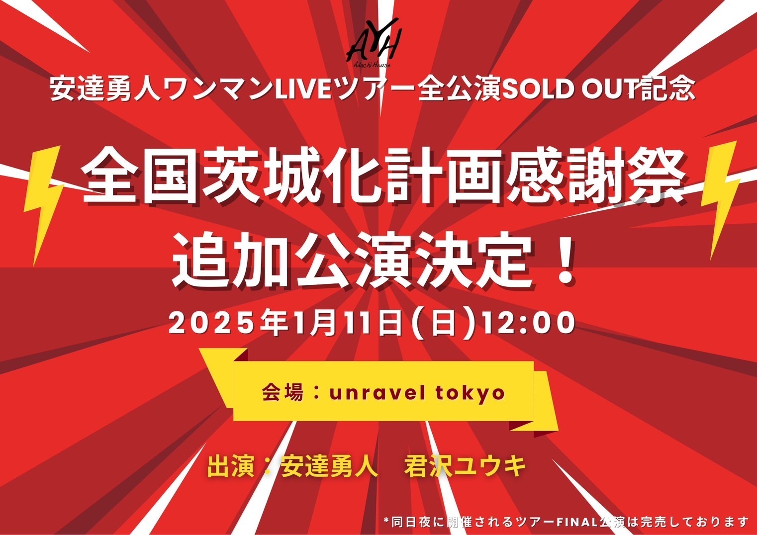 安達勇人LIVEツアーの即完売を記念して、全公演SOLD OUT記念追加公演『全国茨城化計画感謝祭』をツアーFINAL当日、unravel tokyoにて開催します!